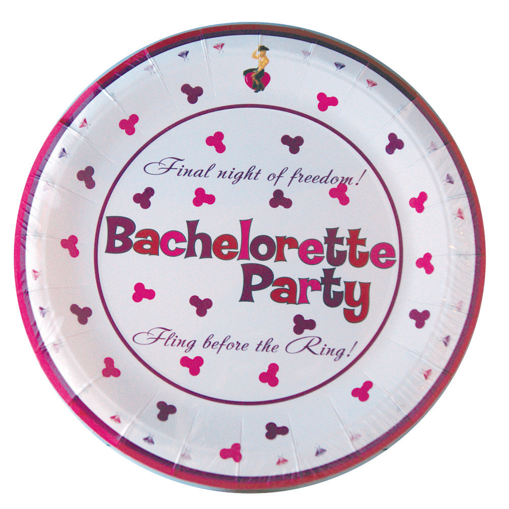 10 צלחות קרטון מאויירות בבולבולים וטבעות יהלום. להנאה מושלמת של המשתתפות במסיבת הרווקות.