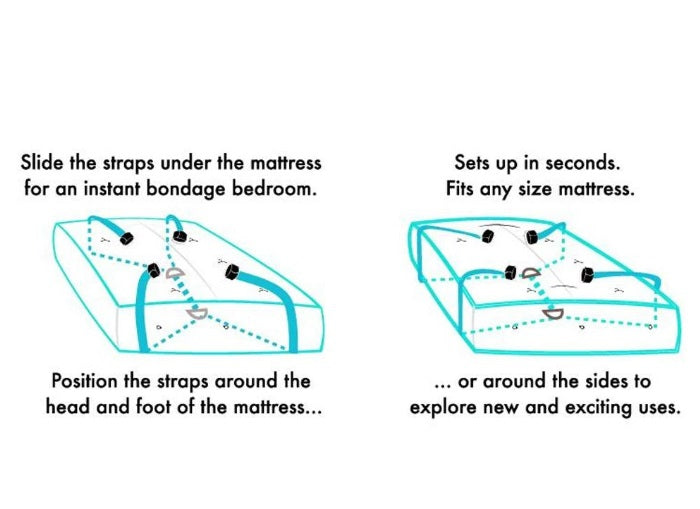 סט קשירות איכותי למתחילות/ים לאיזוק למזרן המיטה, ללא צורך בעמודים. הסט מכיל מערכת רצועות מתחת למזרן ו 4 אזיקים מקטיפה נעימה עם סגירת סקוטש, המתאימים לכל פרק יד, לאישה ולגבר.