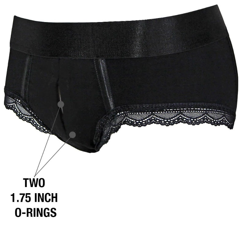 2 הטבעות מתאימות לדילדואים עד קוטר 4.44 ס"מ. טבעת עליונה ממוקמת באיזור עצם הערווה וטבעת נוספת תחתונה באיזור פתח הנרתיק.