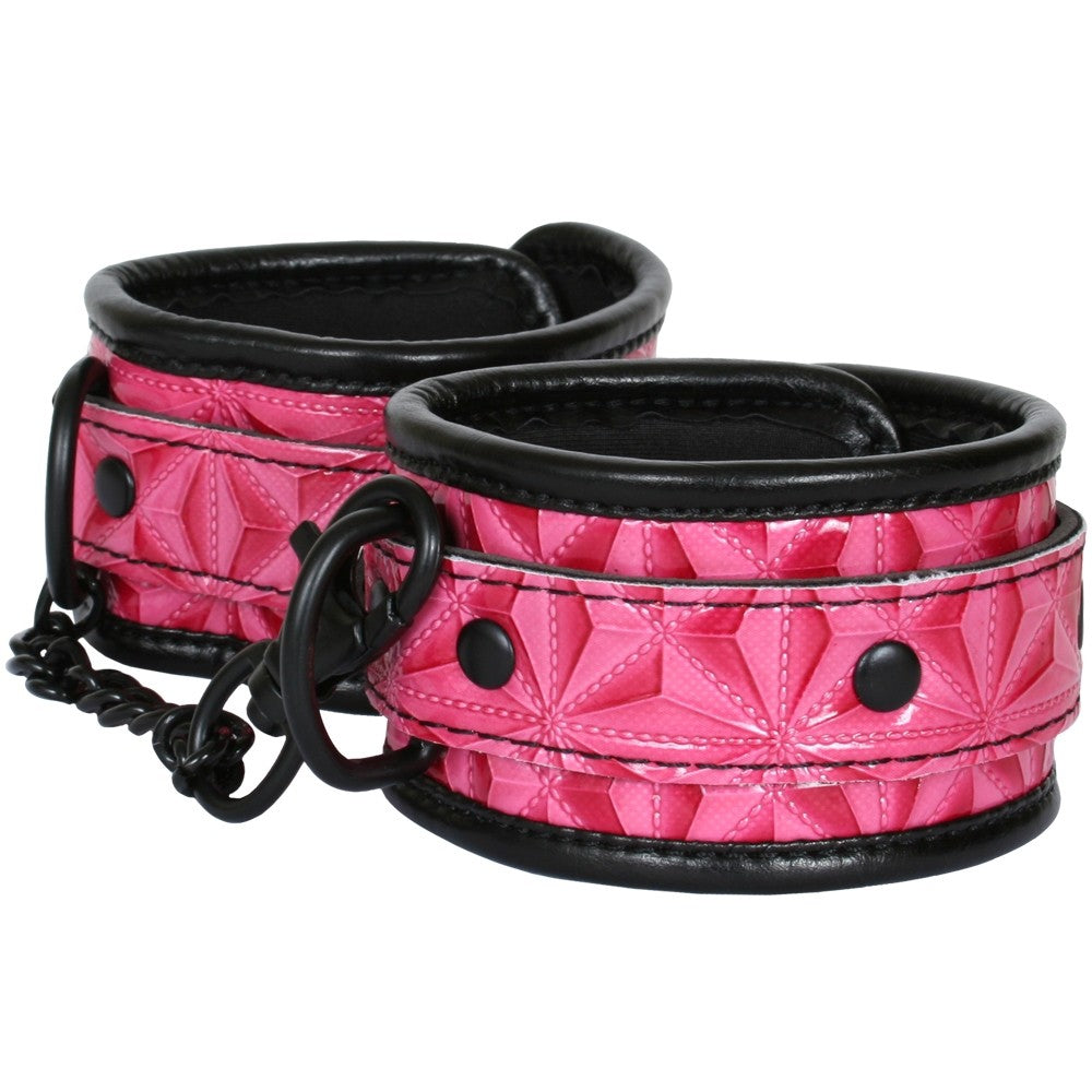 אזיקי ידיים מעוצבים ויפים עם עיטורי מעויינים, בצבע שחור וורוד כהה. מאוזקים בשרשרת שחורה קצרה וטבעות D. סגירה נוחה עם אבזם להתאמה מירבית.
