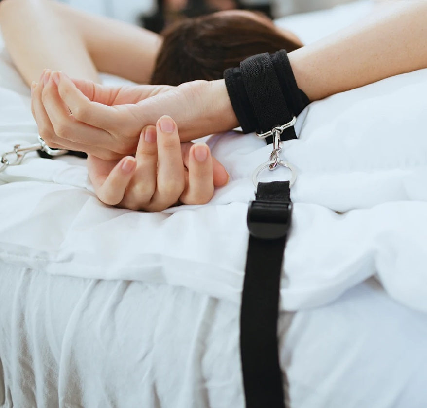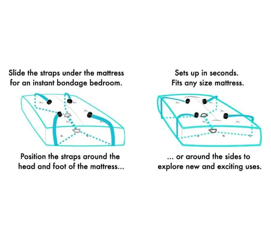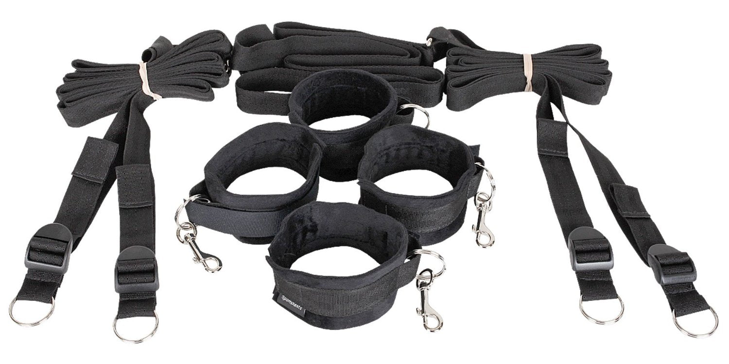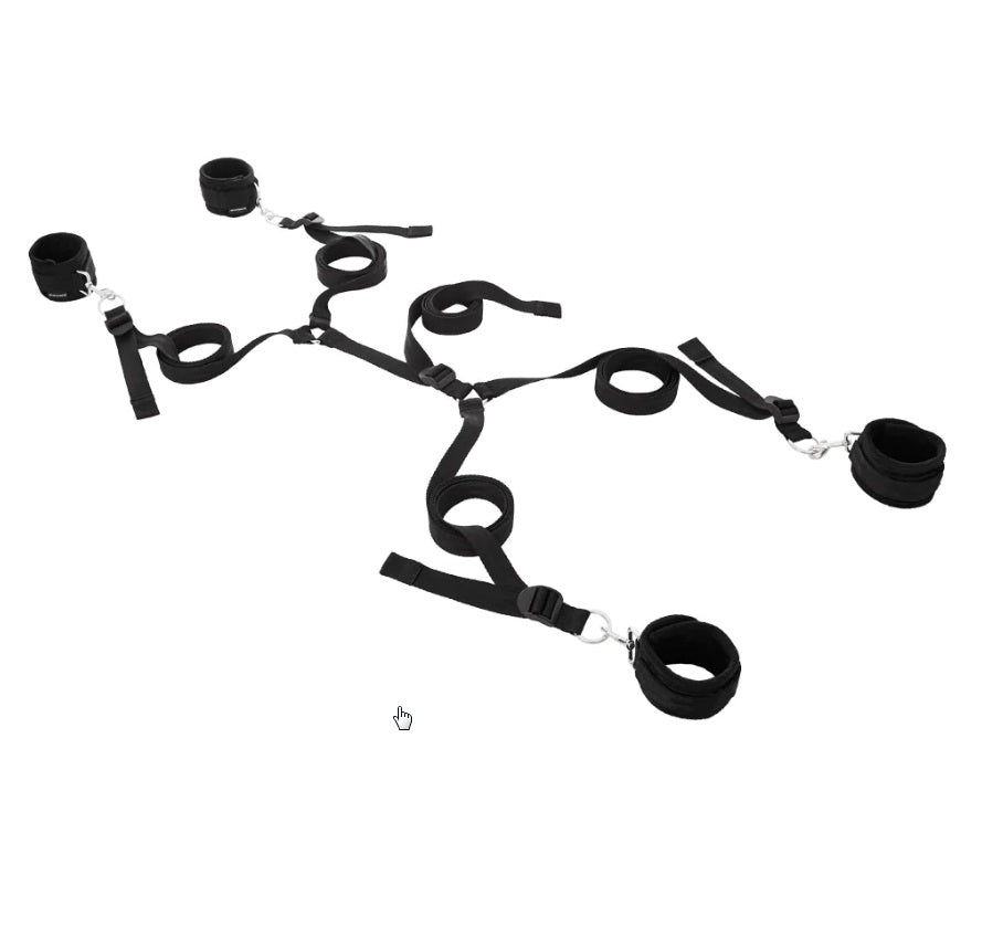 סט הקשירות המושלם למשחקי שליטה במיטה. מכיל 4 אזיקי קטיפה בשילוב סקוטש חזק ושקלים (תפסני מתכת), מתכווננים לפרק היד/ רגל, 4 רצועות עגינה המתחברות לרצועה מרכזית מתחת למיטה.